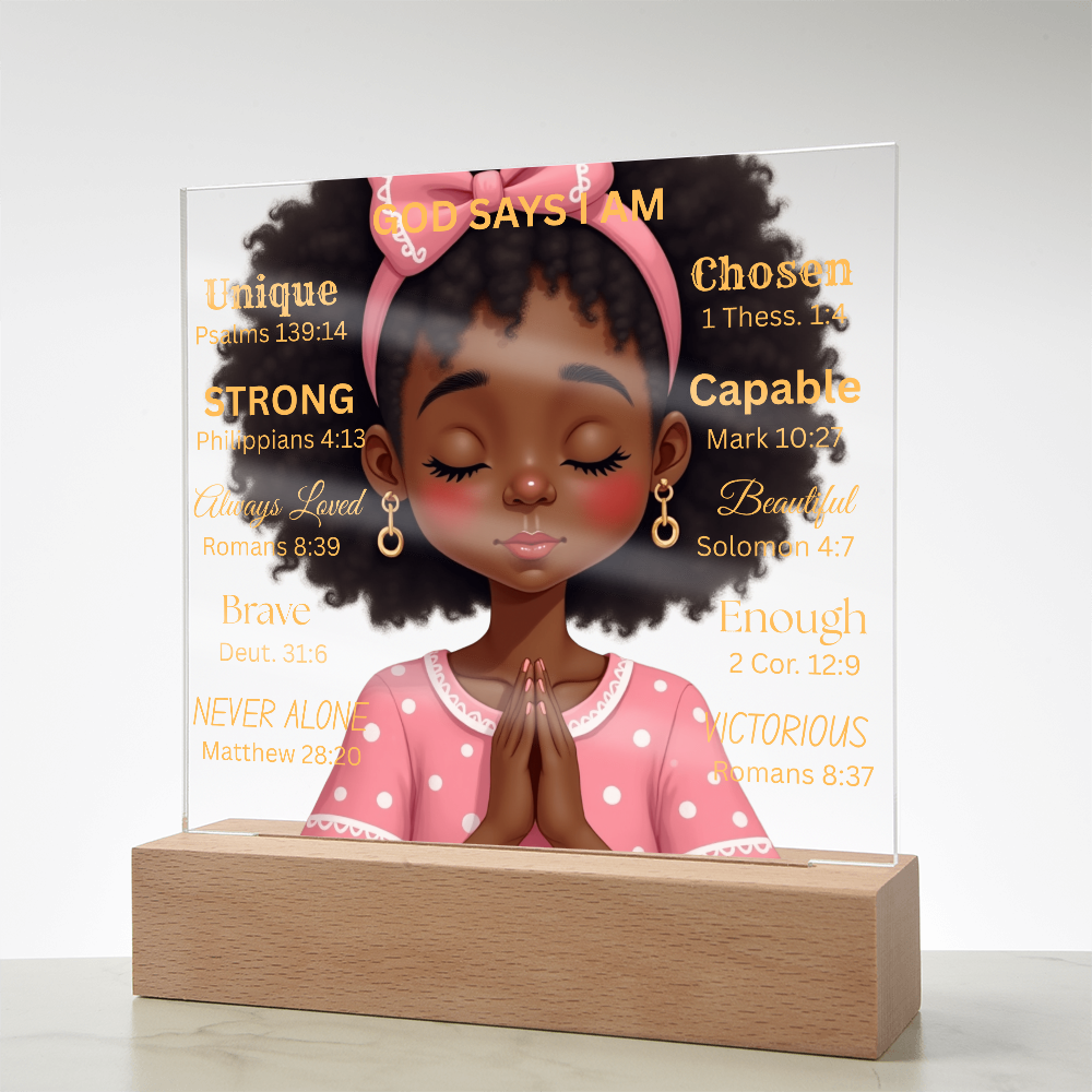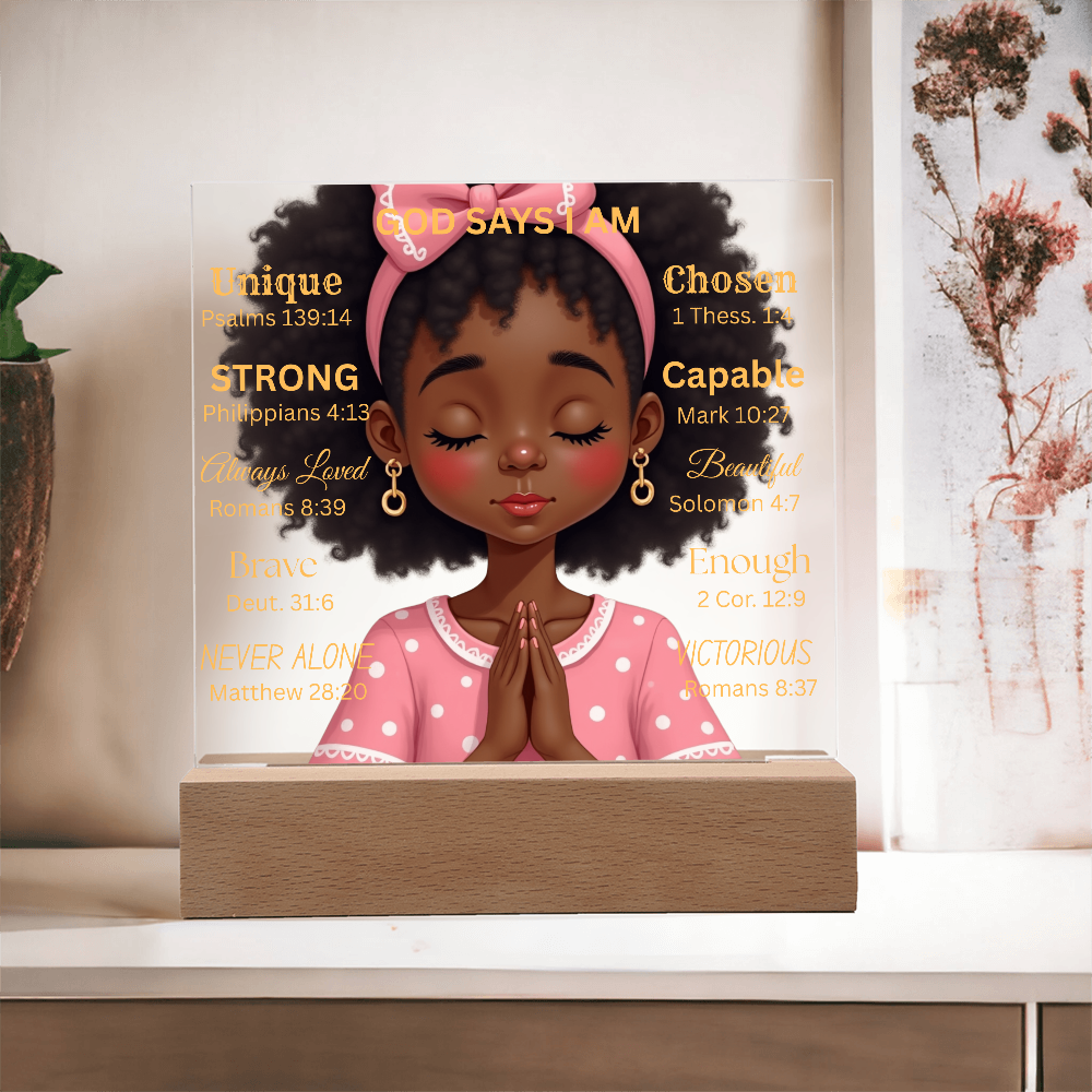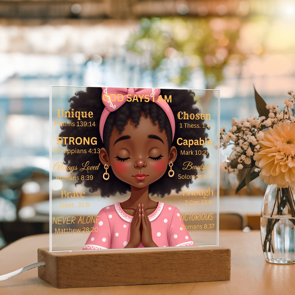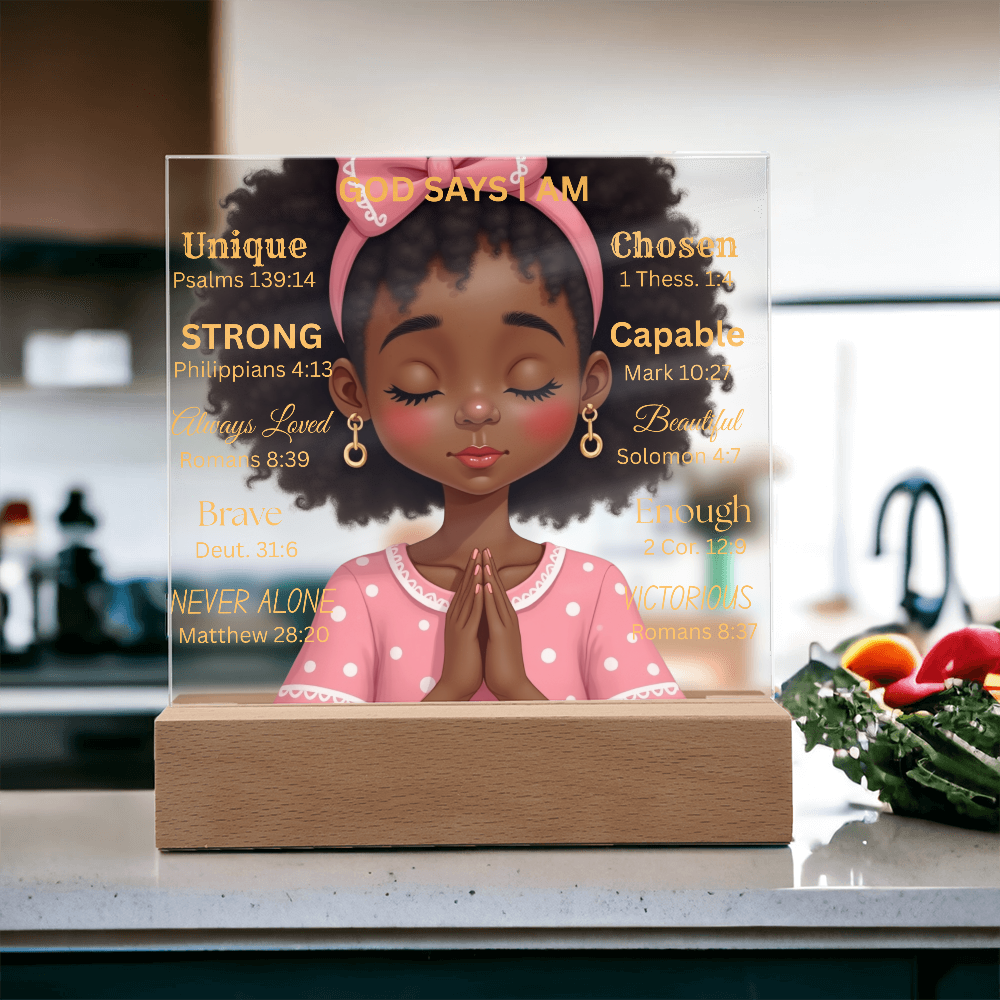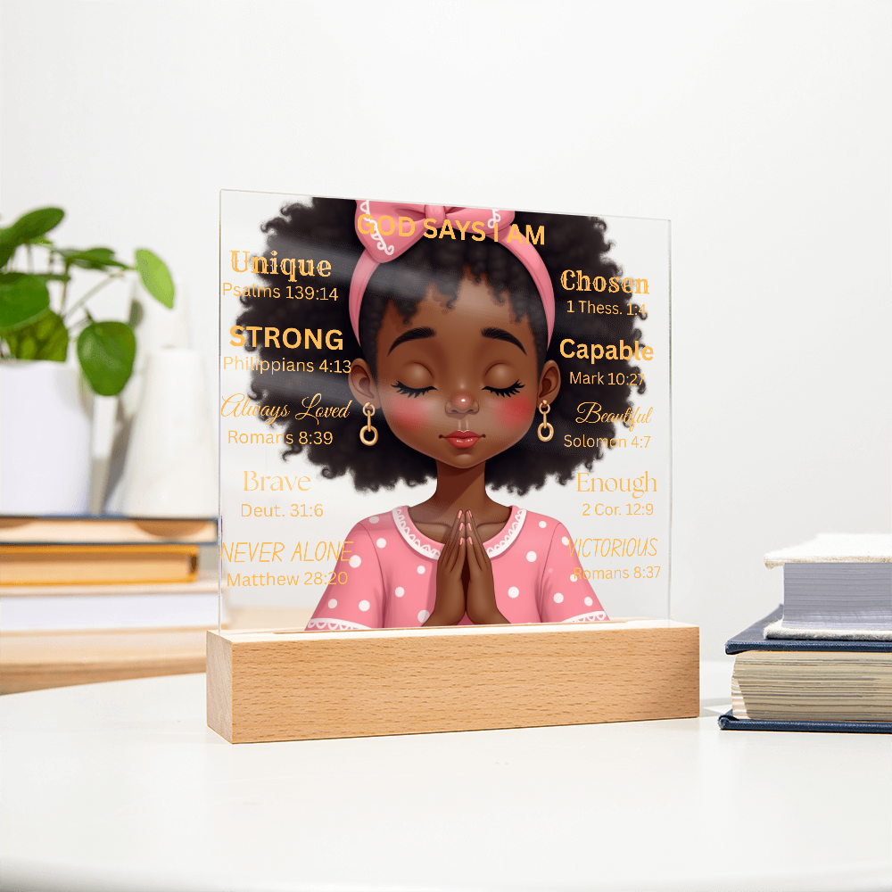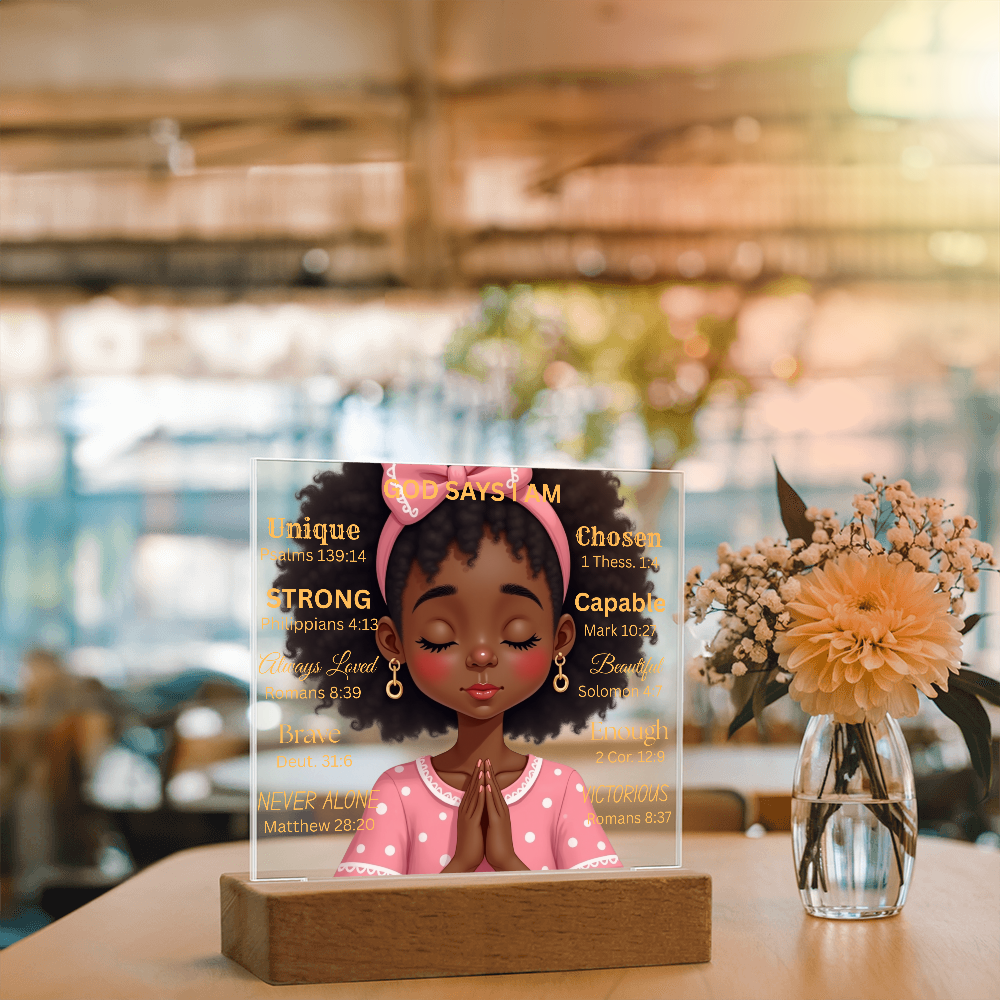 Your plaque will be crafted from premium acrylic with a professionally printed design for a polished look. It comes with a stylish wooden LED base, and you can choose between a USB plug-in option OR a cordless battery-operated option (requires 2 AAA batteries, not included). Both LED bases feature 7 vibrant colors, allowing the user to customize the lighting with various color changes and dynamic cycles.